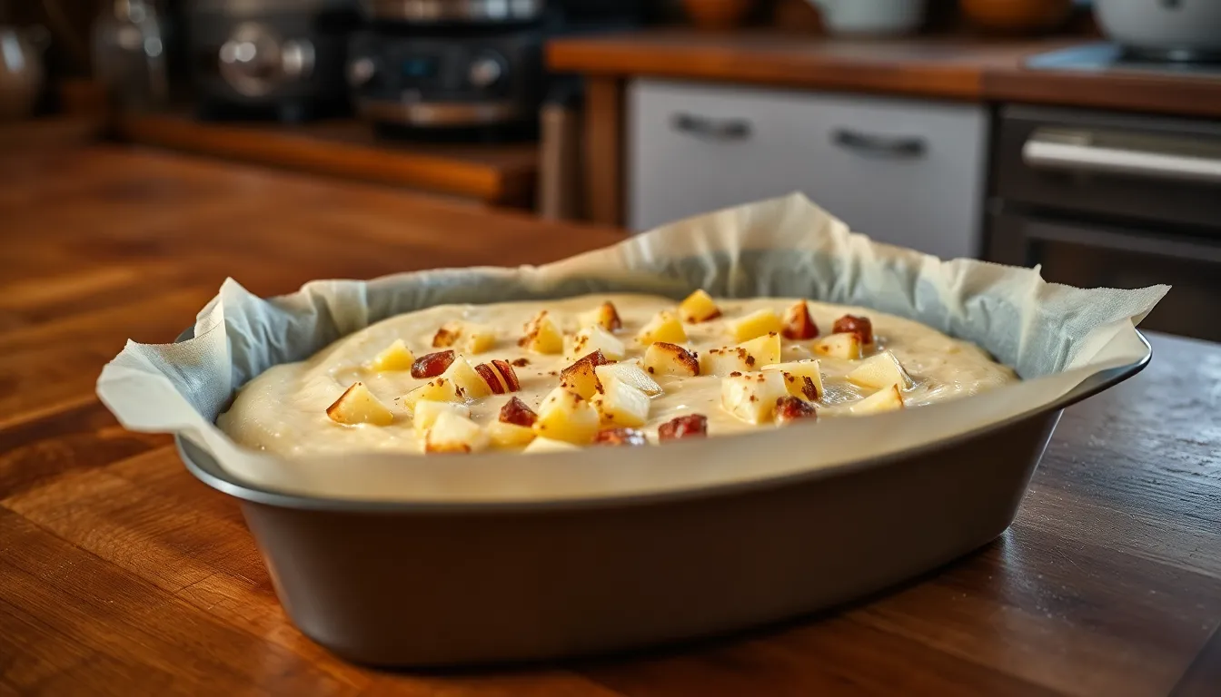 Distribute the rest of your spiced apple mixture evenly across the top of the batter. Some bakers prefer to lightly press the apple pieces partially into the batter while others leave them sitting on top for a more defined fruit layer.