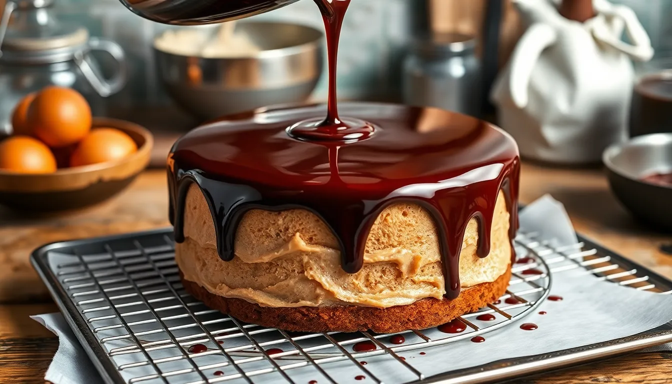 Pour generously to ensure complete coverage, as you’ll need enough volume to create that seamless reflective surface. The frozen cake will set the glaze quickly upon contact, creating that signature glossy finish. Allow the glazed cake to set undisturbed for approximately 5 minutes before making any adjustments.
