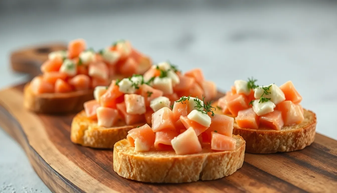 Multiplying the ingredients based on your guest count ensures everyone gets to enjoy this luxurious appetizer. For a gathering of 12-15 people, plan on preparing at least 30-40 individual crab toasts. Purchase about 1½-2 pounds of jumbo lump crab meat to serve a crowd this size. Scale your creamy base ingredients proportionally—for each pound of crab, use 8 ounces of cream cheese or Boursin and ¼ cup of mayonnaise to maintain the perfect consistency.