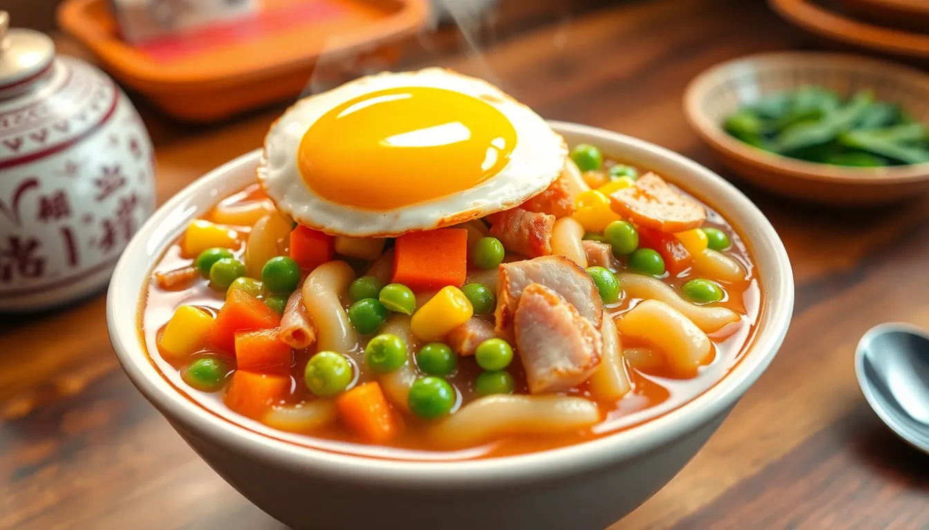 The beauty of Hong Kong macaroni soup lies in its versatility with toppings. Traditional cha chaan teng cafés typically serve this dish with thinly sliced ham or cubed luncheon meat like Spam. Many versions include a perfectly fried sunny-side-up egg sitting atop the soup, adding richness when the yolk breaks into the broth. Bright vegetables like corn kernels, peas, diced carrots, or green beans introduce color and nutrition to your bowl. Finish your creation with freshly chopped scallions and an extra drizzle of sesame oil for an authentic Hong Kong breakfast experience.