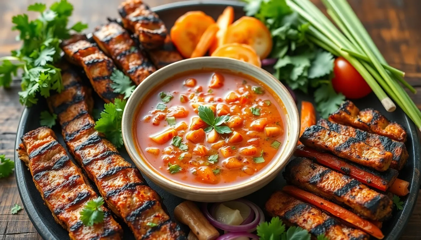 Transform your dining experience with this interactive meal featuring Mam Nem. Thin beef slices cooked tableside in a vinegar broth gain remarkable depth when dipped in Mam Nem mixed with lime garlic and chili. The sauce cuts through the tartness of the broth while adding savory complexity to each bite.
