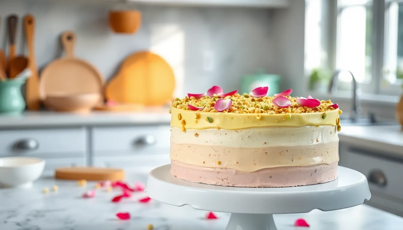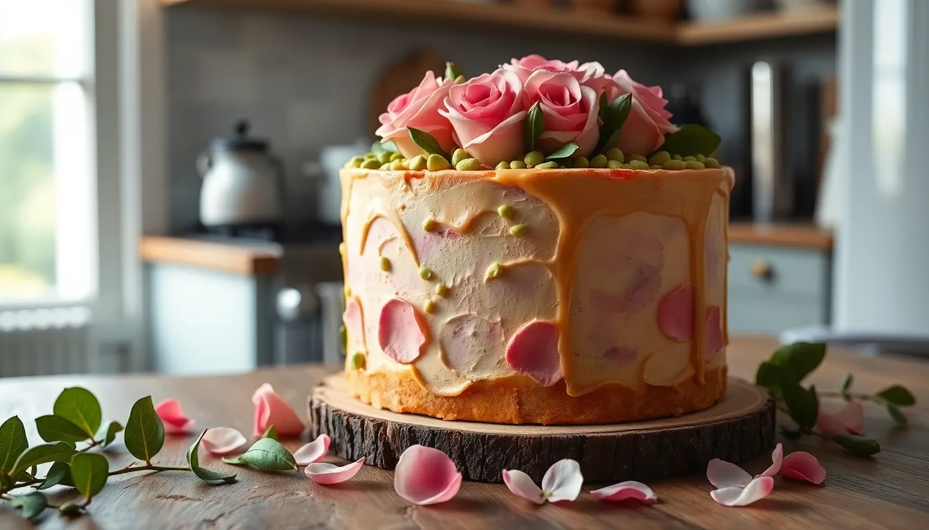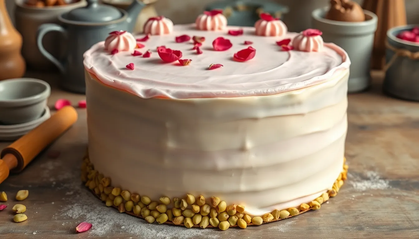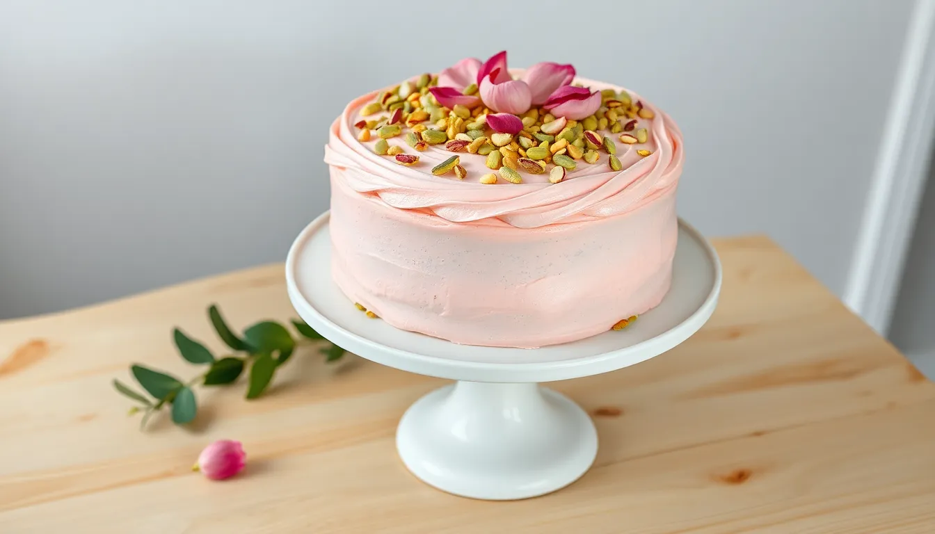 Preparing this pistachio and rose cake in advance can save you time when hosting special events. You can make the cake layers up to 3 days before assembly by wrapping them tightly in plastic wrap after they’ve completely cooled. Store these wrapped layers at room temperature or refrigerate them for optimal freshness.