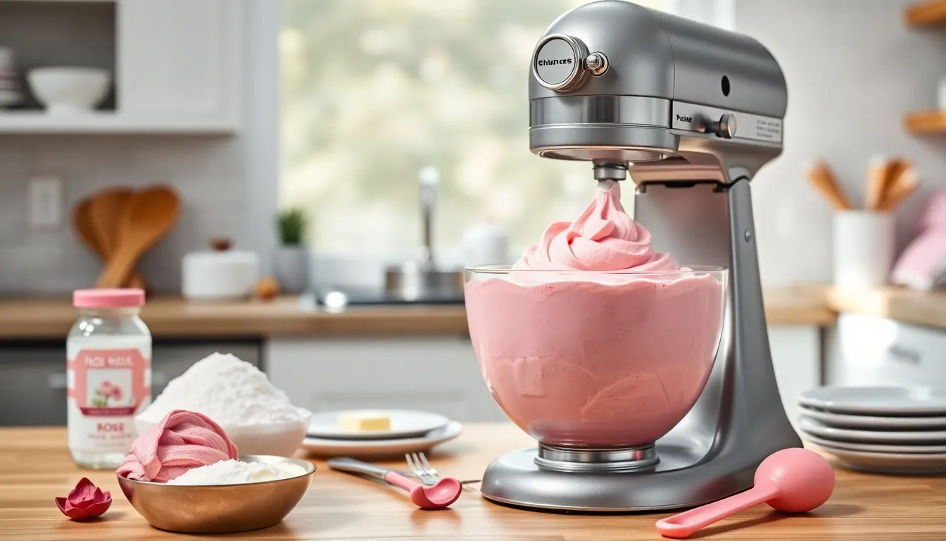 Pour in the heavy cream rose water and vanilla extract then increase the mixer speed to medium-high. Beat for an additional 2-3 minutes until the frosting reaches a light creamy consistency. The heavy cream adds richness while the rose water infuses the frosting with its signature floral aroma.