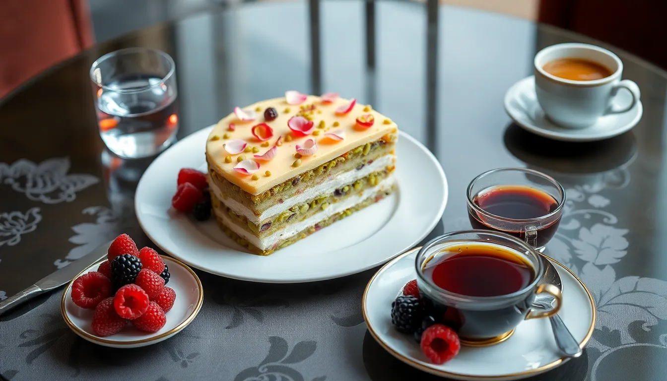 Turkish coffee, Earl Grey tea, champagne, and rose milk tea all complement the cake’s unique flavors beautifully. These beverages enhance the pistachio nuttiness and delicate rose notes. For cultural authenticity, consider serving with black tea as in Persian tradition or alongside rosewater as in Turkish customs.