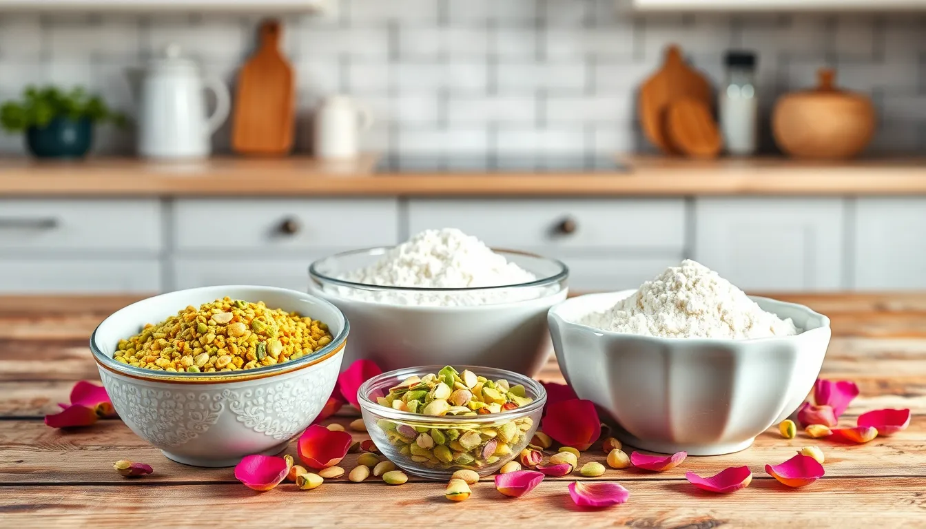 Creating this elegant pistachio and rose cake requires exact ingredients that contribute to its unique flavor profile and stunning appearance. Let’s break down everything you’ll need for each component of this exotic dessert.