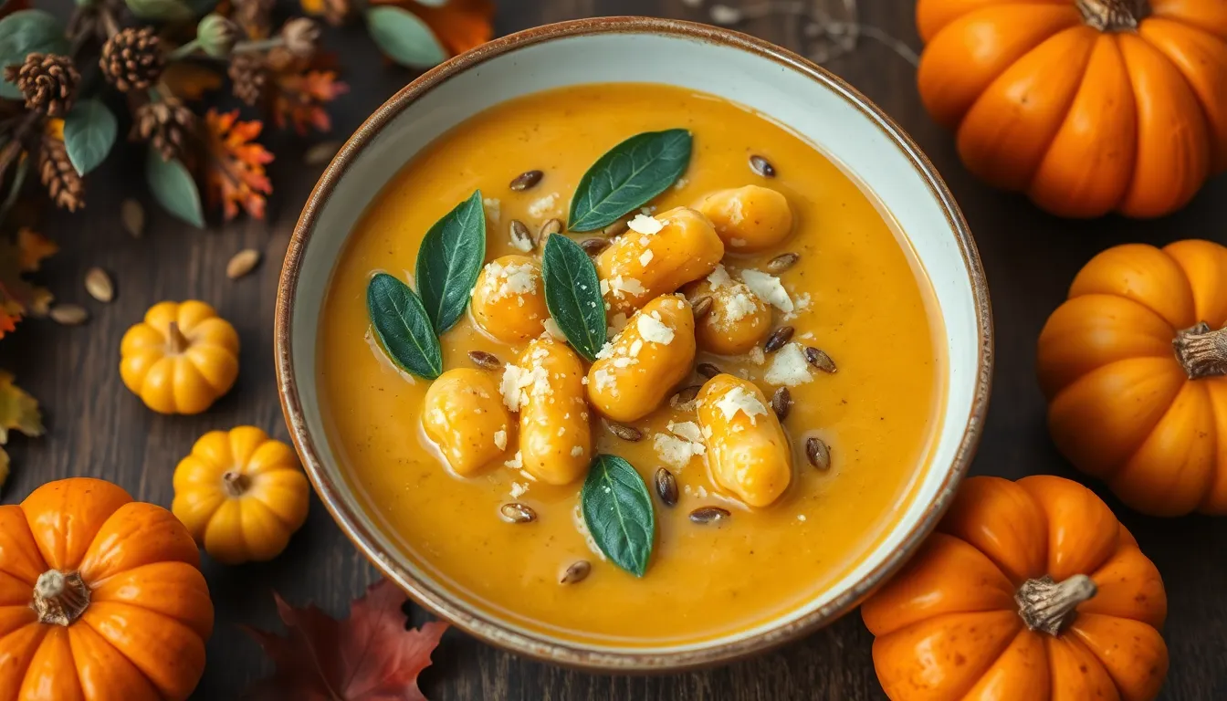 Remove the pot from heat and let the soup stand for 2-3 minutes to allow the flavors to settle. Ladle the hot soup into pre-warmed deep serving bowls ensuring each portion contains a generous amount of gnocchi. Garnish with a drizzle of high-quality olive oil freshly grated Parmesan cheese and additional fresh sage leaves. For extra texture sprinkle toasted pumpkin seeds on top just before serving. The soup should have a velvety consistency that coats the back of a spoon while the gnocchi should be tender and pillowy.
