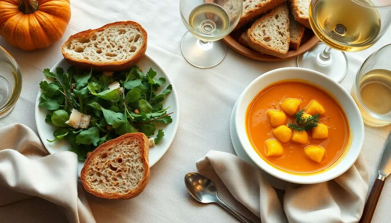 For a complete fall dinner party menu build around your pumpkin gnocchi soup as the star. Begin with small cups of the soup as an appetizer followed by a main course of roasted chicken or pork tenderloin. Alternatively serve larger portions of the soup as the main dish accompanied by a substantial salad and bread basket for a casual yet sophisticated meal.