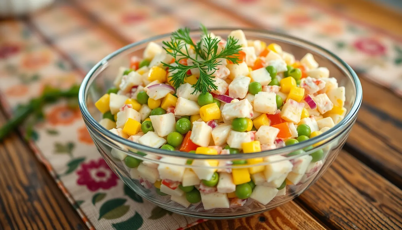 The vegetables provide essential texture and freshness to balance the rich dressing. Hard-boiled eggs add protein and creaminess while cooked rice gives the salad its characteristic heartiness. Sweet corn contributes a pop of color and sweetness that distinguishes Russian crab salad from other seafood preparations.