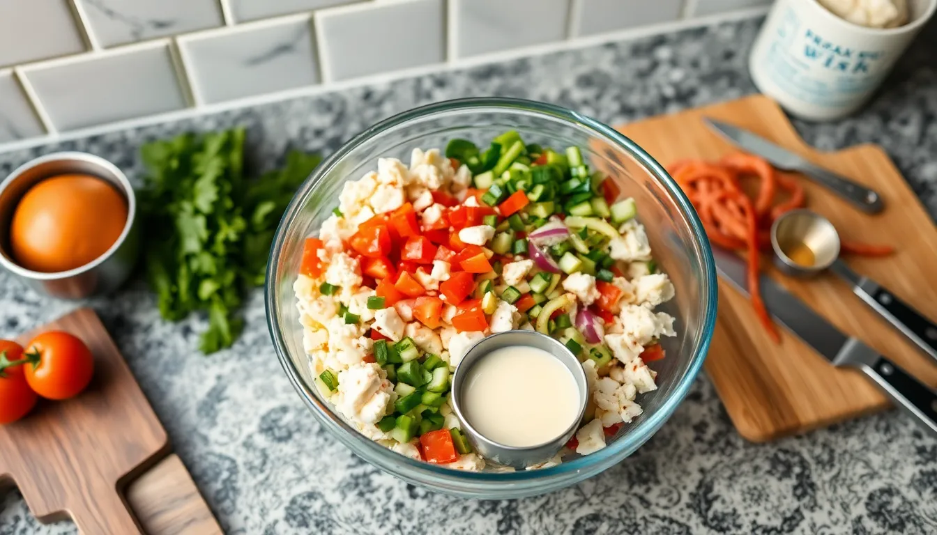 Start by washing all your vegetables thoroughly under cold running water. Dice the cucumber into small 1/4-inch cubes and place them in your mixing bowl. Finely chop the red onion into tiny pieces – you want enough for flavor but not so much that it overpowers the delicate crab taste. Drain the sweet corn kernels completely using a colander to remove excess liquid. For optional green peas if using them peel and dice them into small pieces similar in size to the corn kernels. Pat all vegetables dry with paper towels to prevent excess moisture from diluting your dressing.