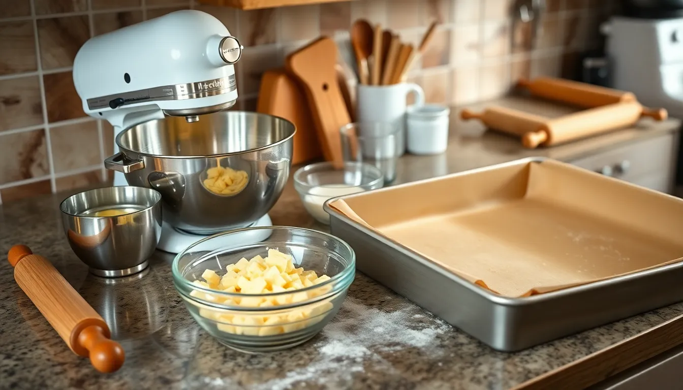 Essential equipment includes a large mixing bowl, measuring cups, rolling pin, and rectangular baking pan. Traditional preparation benefits from a wooden working surface and specialized dough roller, though modern alternatives like a stand mixer can also be used. Having all equipment ready before starting ensures a smooth preparation process.