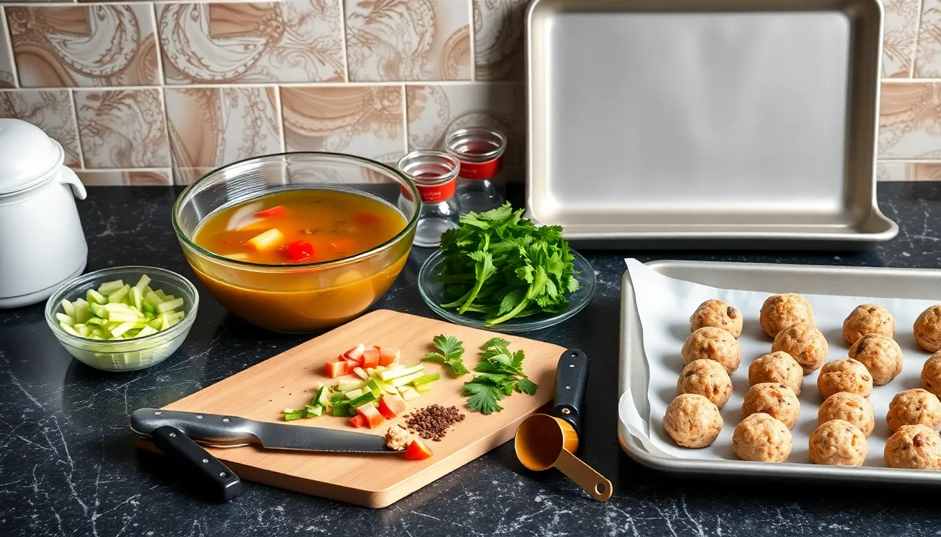 The essential equipment includes a large mixing bowl for the meatballs, a baking sheet for cooking them, and a Dutch oven or large pot for the broth. A cookie scoop helps create uniform meatballs, while basic measuring tools ensure proper ingredient proportions. No specialized equipment is needed, making this recipe accessible for most home kitchens.