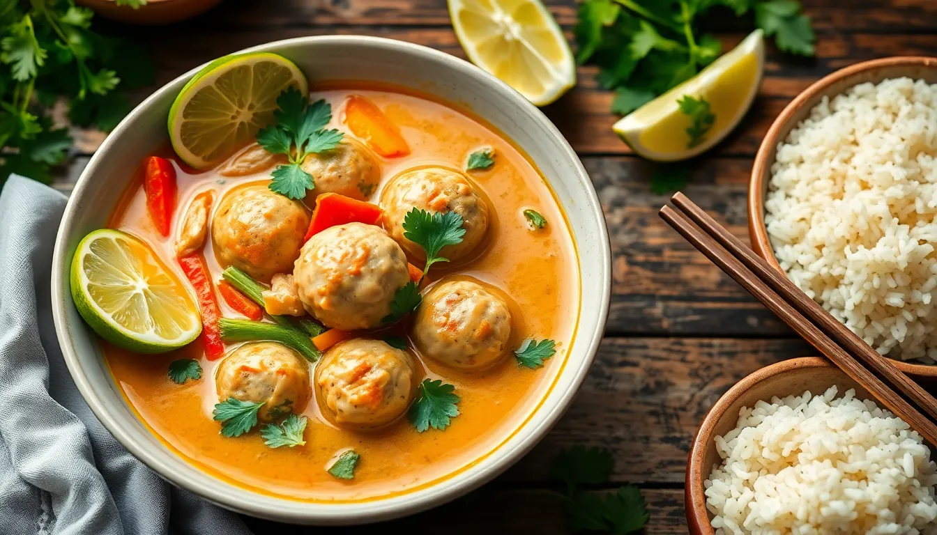 Present your Thai-inspired chicken meatball soup in wide shallow bowls to showcase both the golden meatballs and vibrant coconut curry broth. The visual appeal of this dish deserves proper presentation with the meatballs partially submerged in the creamy broth.