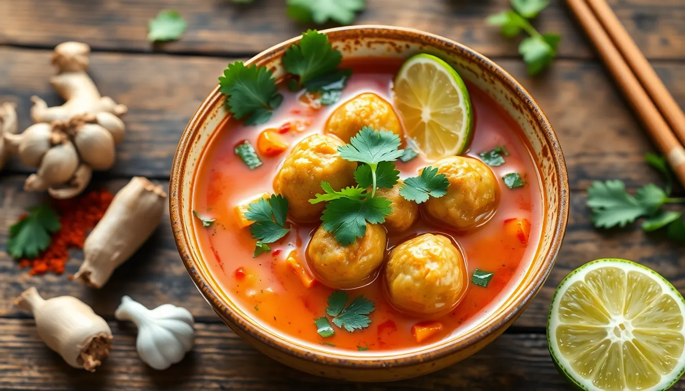 This soup captures authentic Thai flavors through its balanced combination of lemongrass, ginger, garlic, Thai red curry paste, coconut milk, and lime juice. The harmony of spicy, sweet, savory, and sour elements follows traditional Thai culinary philosophy. The recipe incorporates classic Thai aromatics into both the broth and meatballs, with proper layering techniques to ensure flavors meld beautifully while maintaining the vibrant freshness of herbs added at the end.